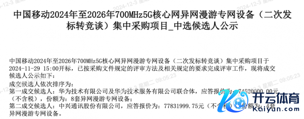 C114讯 12月3日音讯(九九)中国转移(600941)通采购与招标网日前发布中国转移2024年至2026年700MHz 5G中枢网异网漫游专网成立(二次发标转竞谈)聚集采购面貌中选候选东说念主,华为、中兴中标。