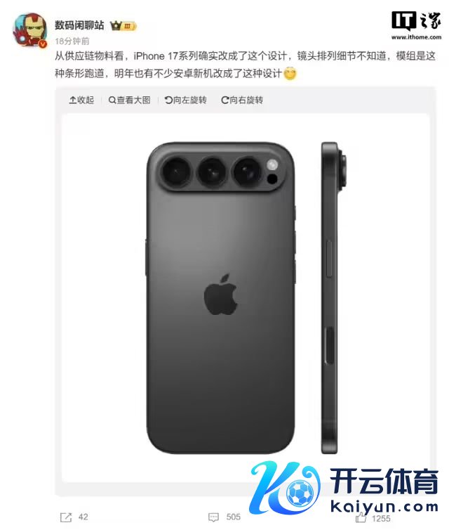 一个是微博博主发文称,供应链物料炫耀,iPhone 17 系列手机“如实”将会改成如下图所示的横条形三摄布局,目下镜头摆设细节暂时未知,模组改采“条形跑谈”运筹帷幄。