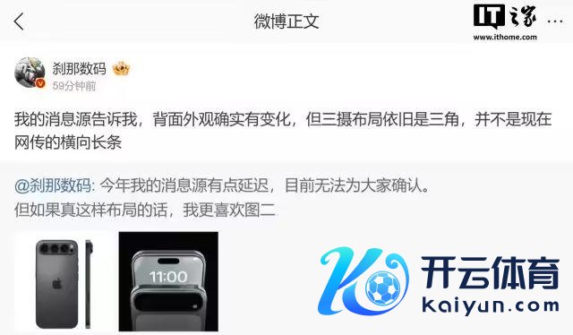 不外就在今天(12 月 18 日)下昼,@一瞬数码 称,其音问源暴露,后头外不雅如实有变化,但三摄布局依旧是三角,并不是目下网传的横向长条。