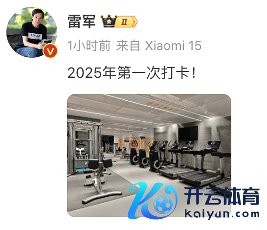 今天一早,小米首创东说念主、董事长兼CEO雷军在酬酢媒体上晒出了他在健身房的相片kaiyun官方网站,并配文:“2025年第一次打卡!”