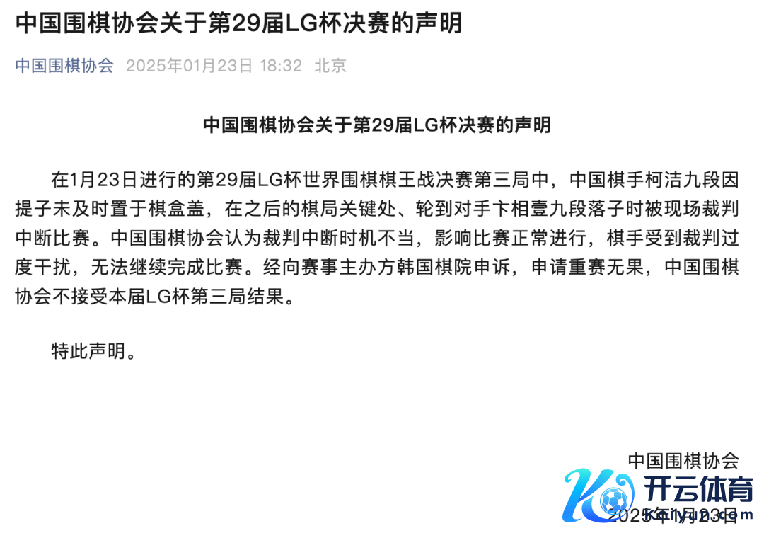 在1月23日进行的第29届LG杯寰宇围棋棋王战决赛第三局中,中国棋手柯洁九段因提子未实时置于棋盒盖,在之后的棋局要津处、轮到敌手卞相壹九段落子时被现场裁判中断比赛。中国围棋协会认为裁判中断时机不当,影响比赛闲居进行,棋手受到裁判过度干豫,无法不息完成比赛。经向赛事专揽方韩国棋院讲演,央求重赛无果,中国围棋协会不秉承本届LG杯第三局遵守。
