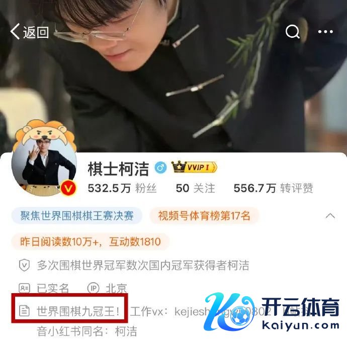 23日晚,据中国蓝新闻报谈,柯洁个东谈主微博简介备注改为:“寰宇围棋九冠王!”疑似回答今天的比赛遵守。