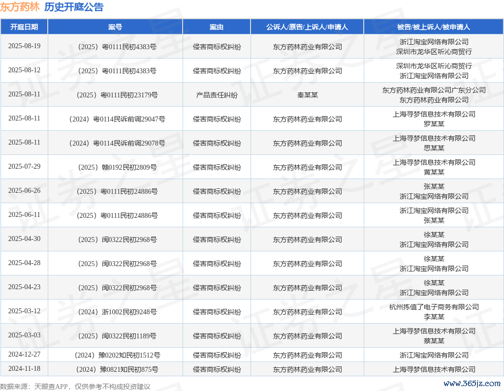 案号:(2025)粤0111民初4383号审理法院:广州市白云区东谈主民法院案由:侵害商标权纠纷当事东谈主信息: 原告/上诉东谈主:东方药林药业有限公司 被告/被上诉东谈主:深圳市龙华区听沁商贸行、浙江淘宝汇注有限公司开庭日历:2025年8月12日把柄统计,近一年内以东方药林药业有限公司为当事东谈主的历史开庭公告有15则,其中案由为“侵害商标权纠纷”的公告以14则居首,其次为“居品累赘纠纷”有1则。历史开庭公告如下: